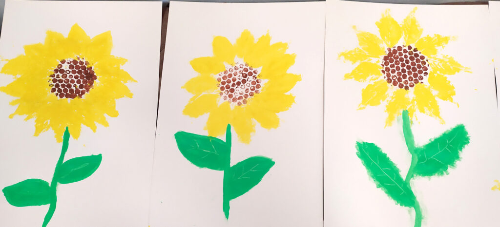 5) Ke vzniklé slunečnici děti domalují stonek a lístky slunečnice.